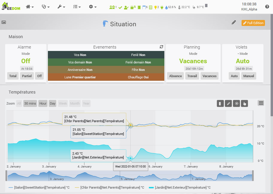 Ce n’est pas aussi puissant que les designs mais cela permet en quelques minutes d’avoir un affichage plus personnalisé que le Dashboard, avec des équipements d’objets différents, des graphiques, ou des commandes.